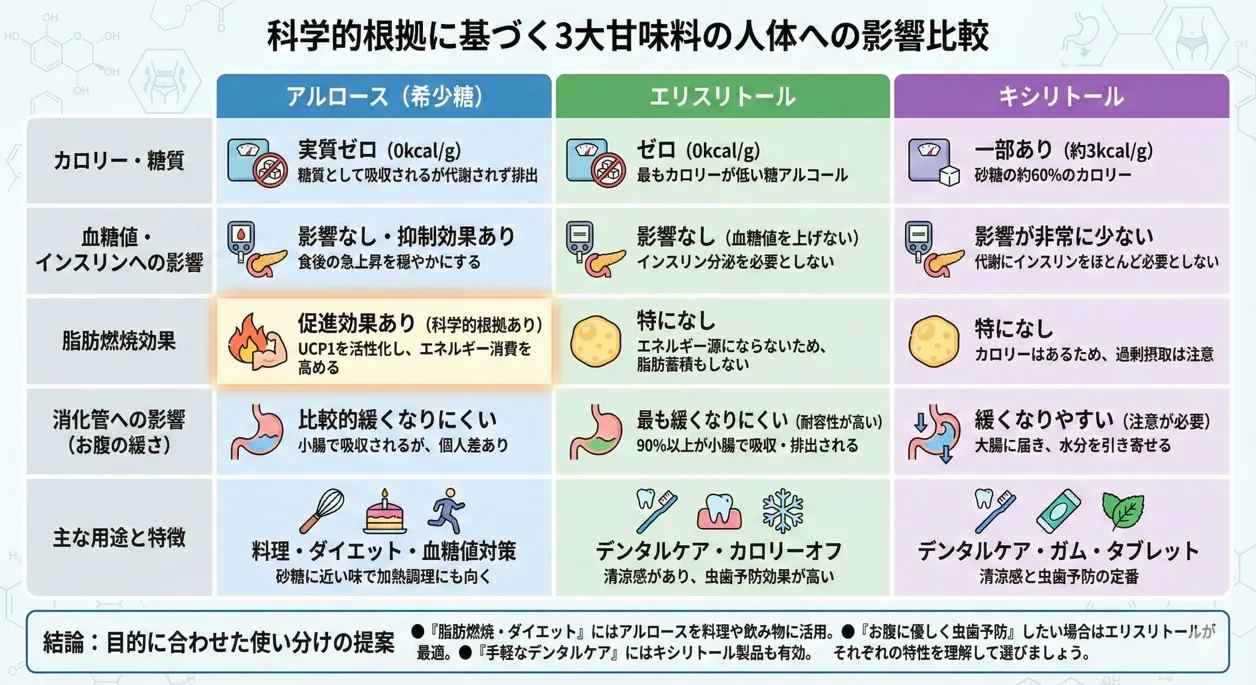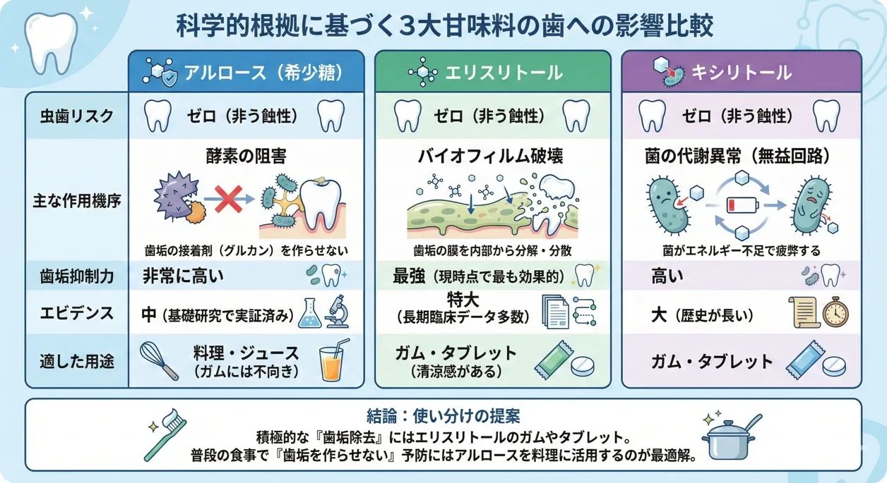 【提案】 日常生活では料理にアルロースを使い、食後のケアとしてエリスリトールのタブレットを活用する。これが、それぞれの科学的特性を最大に活かした「最強の歯の守り方」と言えます。