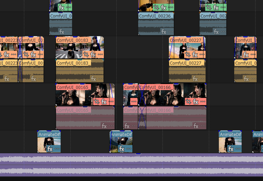 最後は、元の曲を動画編集ソフトのタイムラインに置いて、そこに音も入っている動画ファイルなので、音の位置を合わせれば動画データが沢山あっても簡単にきっちり合わせる事ができます。(一番下のラインが曲で、その上に動画をはめ込んでます)